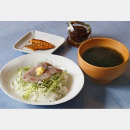 ご飯のうえに大根のつま、きゅうり、大葉をタップリ。その上に鯵の切り身をのせ、豆板醤ソースでいただきます。豆板醤はそら豆と赤唐辛子に、塩と小麦粉を加えて漬け込み、天日で干しながら3年間発酵熟成させた中国料理の調味料です。豆板醤を加えることで、コクとまろやかな辛味が加わって、鯵のうま味をいっそう引き立てます。