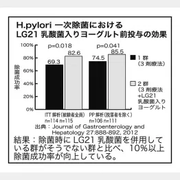 この乳酸菌は酸に強く、胃の粘膜に生きて長く留まって活発に活動するという特徴を持っているが、ピロリ菌保菌者29人に1日2回、LG21乳酸菌入りのヨーグルトを1回あたり90グラム摂取してもらい、その前後でピロリ菌数の変化を調べたところ、通常のヨーグルト(プラセボ)とLG21乳酸菌入りヨーグルトでは、明らかに後者に有意な低下が見られたという。さらに、ピロリ菌除菌をする際にLG21乳酸菌を併用すると、除菌効果が高まることも報告されている。