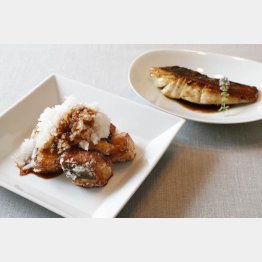 (3)大根おろしの水分を軽くしぼって揚げたスズキの上にのせ、豆板醤、醤油、米酢を合わせたものをかけていただく。