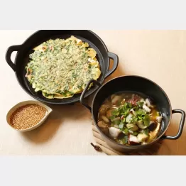 薄力粉(大さじ4)、片栗粉(大さじ3)、ダシ(大さじ1=水で代用可能)、酒(大さじ1)、卵(1個)、白胡椒(少々)を合わせる。フライパンにごま油大さじ1を入れて中火にかけ、薄力粉などを合わせたものを流し入れ円形に。タコの足の粗みじん切り2分の1カップと、ニラの小口切り4分の1束を全体に散らす。底面に火が通ったら上下を返し、周りからごま油大さじ1を流し入れ、カリッとするまで焼く。一口大に切り、たれ(醤油大さじ1と2分の1、米酢大さじ1、コチュジャン小さじ1、白ごま大さじ1)をつけていただく。