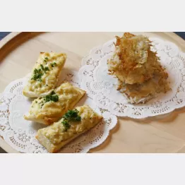 メインはローラーでつぶしたパンの上に、マヨネーズと卵黄と和えたしらす干しをのせて焼いたトースト。もう一品はパルメザンチーズと薄力粉を合わせてフライパンで薄く焼き上げたガレットです。ガレットはフランスの郷土料理で、丸く薄いものを意味します。