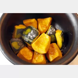 そして、カボチャにはさわやかな甘味がある。甘味は果実に蓄えられた炭水化物が糖質に変化することによって生じる。これは熟成と呼ばれるプロセス。熟成は果実の内部に含まれる分解酵素によるもの。分解酵素の反応は純粋な化学反応である。これは生命活動が途絶えても自動的に起こるので、甘味の増加は収穫後でも進行する。今回のレシピのように、煮たり、炒められたカボチャの実を箸でほぐすと細く糸を引くように見えるのは食物繊維がたっぷり含まれているから。ビタミンCやE、ミネラルも豊富なので、優れた健康食品といえる。