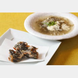 もずくは塩抜きして、水切り。長い場合は1~3カ所切る。そこに桜エビ、片栗粉、薄力粉、生姜のみじん切り、酒を合わせ、軽くまぜる。中温(170~180度)より低めの油で3~5分、しっかりと揚げる(写真)。ペーパータオルに取って油を切り、塩を軽くふる。
