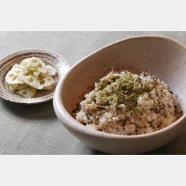 1品目は牛肉とゴボウのまぜご飯です。牛肉とゴボウの煮汁はだしを利かせて塩分を控え、粉山椒は味付けしたまぜご飯に散らします。