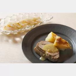 (4)焼き汁を小鍋に入れて煮詰め、味を見てソースにする。肩ロースは15分置いたら好みの厚さに切り、ジャガイモを添えてソースをかける。