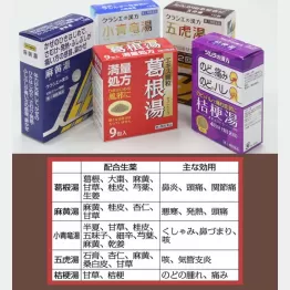 「3大漢方薬の葛根湯、麻黄湯、小青竜湯は、いずれも体を温めることで免疫力を高め、症状を改善します。熱があっても寒けがあるようなタイプに効果的で、体が火照るタイプには不向きです。『あれ、悪寒がしたな』と思ったら、それが風邪のひき始めで、軽い悪寒で肩が凝るときは葛根湯を、インフルエンザのような高熱でも寒けがして節々が痛むときは麻黄湯がお薦め。小青竜湯は、特に水のような透明の鼻水を改善する効果が高く、花粉症をはじめアレルギー性鼻炎にも最適です」