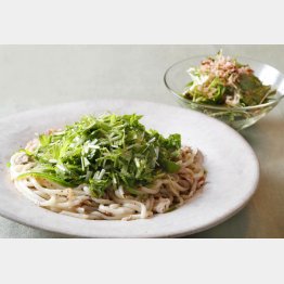 水菜2分の1束の軸下を落とし、長さ4センチに切り、柚子胡椒小さじ2分の1、オリーブオイル大さじ2、米酢大さじ1と2分の1、薄口醤油大さじ1を合わせたドレッシングで和え、削ったかつお節を2分の1カップほど合わせる。よくまぜていただく。