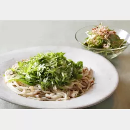 今回は豚バラ肉との焼きうどんと、かつお節とのサラダの2品です。どちらも火を通さないのはシャキシャキとしたみずみずしい食感を楽しんでいただきたいからです。