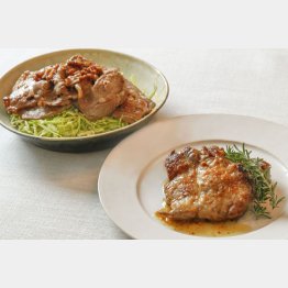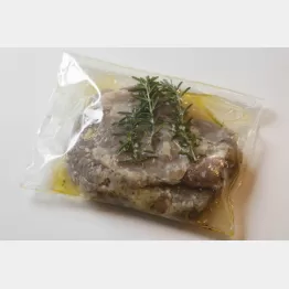 豚肩ロースの脂の部分に下包丁を入れ、焼き縮みを防ぐ。ニンニク、塩、オリーブオイル(大さじ2)、レモン汁、白胡椒、ローズマリーを合わせ、豚肉に擦り込み、30分マリネする(写真)。水気を抑え、薄力粉を茶こしを通して全体にふる。オリーブオイル(大さじ1)をフライパンで中火で熱し、豚肉の両面を蓋をして焼く。焼き上がりに白胡椒をふり、バターをのせ、器に盛る。