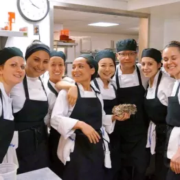 (2)石づきを切り取ったしめじを①に加えて軽く炒めたら、水を加えてひと煮立ちさせる。