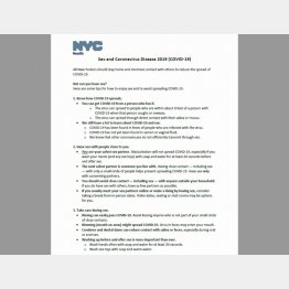 そんな折、感染の激震地である米ニューヨーク市の保健局が、21日に「コロナ流行下のセックスに関するガイドライン」を公開した。「Sex and Coronavirus Disease 2019(COVID-19)」(セックスと新型コロナウイルス感染症)と題した文書がそれだ。