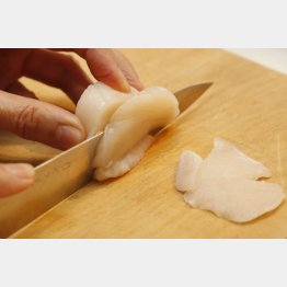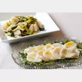 ホタテ貝の脇についている柱を下にして一粒を4枚ぐらいに薄く切り(写真)、両面に塩をほんの少し振り、冷蔵庫で15分寝かせる。器に春菊の葉を敷き、ホタテの薄切りを並べたら、オリーブオイル、アンチョビー、レモン汁、塩(小さじ4分の1)、白胡椒をよく交ぜて、全体に回しかける。