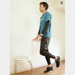 両足を肩幅に開き、頭を真上に引っ張られるように、ゆっくりつま先立ちをする。かかとを上げきったら、下げる。余裕があれば片足で(写真D)。椅子の背もたれをつかんでやってもいい。