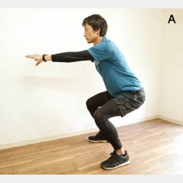 ②つま先を軽く外側に向け、両手を水平に伸ばし、お尻を後ろに引きながら、ゆっくりと腰を落とす(写真A)。