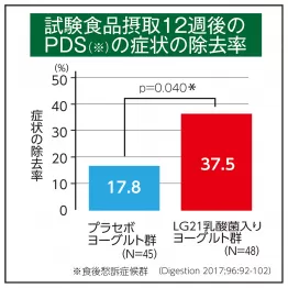 FDの改善効果が報告されているのはLG21乳酸菌と呼ばれる種類の乳酸菌。臨床研究によってFDの改善にも役立つことが研究報告され、スイスで発行されている医学専門誌「Digestion」に掲載されたのだ。特に、食後の胃もたれや早期膨満感の症状が大きく改善されたと報告されていることに注目したい。