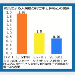 それを裏付けるデータがある。人間の肥満度を表す体格指数にBMIがあるが、これが18・5~24・9、いわゆる〈標準〉体形の人の肺炎死亡率を1とした場合、その相対的な死亡率は18・5未満の〈痩せ〉は1・93倍と増え、25以上〈肥満〉は逆に0・79と下がるという。つまり、肺炎リスクに関しては、太った人の方が痩せた人より2・4分の1も死亡率が低いのだ。