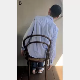 前述の通り、背筋を伸ばした状態は腰痛を起こしにくいが、それを「自力」で維持し続けるのも腰痛を招く。そこで、硬めのクッションや枕などを椅子の背もたれと腰・骨盤の間に入れる。クッション、またはバスタオルを折り曲げたものを、お尻の後方に入れるのもいい(写真A)。