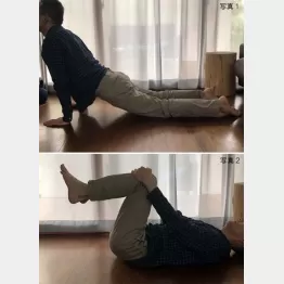 ①あおむけに寝て、太ももの裏、または膝から下を抱え込み、腰の関節や筋肉を伸ばす。片脚でやってみて、問題なければ両脚を抱える(写真2)。②腰の下に手のひらを入れ、息を吸い、ゆっくり吐きながら、腰骨で手のひらを下に押し付けるようにする。