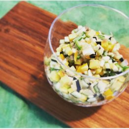 今回は、ジメジメしてなにかと食欲が落ちがちな梅雨の時季にも箸がすすむ「洋風みそだし」です。「だし」は山形の郷土料理で、夏野菜を細かく刻んで味付けしたもので、白いご飯にのせて食べる夏の風物詩のレシピです。本来は鰹だしのつゆなどで味付けするのですが、私はみそで作ってみました。