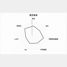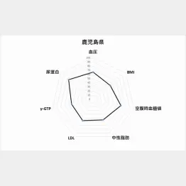 総合4位は鹿児島県だ。40代男性でも4位に入っており、不健康強豪県の一角を占めている。尿蛋白、血糖値、血圧の偏差値が高い。とくに尿蛋白は75.5で全国トップだ。全受診者の1.9%が2+以上となっており、腎臓病患者の増加が懸念される。しかしBMIは低めで、ほぼ全国平均並み。また鹿児島といえば薩摩焼酎の印象が強いが、γ‐GTPも全国平均よりやや高い程度だ。肝臓が丈夫なのだろうか。
