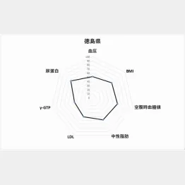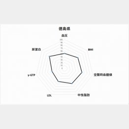 3位から6位までは東北・北海道勢だが、7位から9位までを四国勢が占めている。そこで7位の徳島県と、8位の香川県のレーダーチャートを用意した。徳島県は尿蛋白が高く、香川県は中性脂肪が高い。徳島県の尿蛋白の不健康偏差値は66.9で、全国3位だ。香川県の中性脂肪は71.0で、こちらも全国3位となっている。また空腹時血糖値は徳島県が61.5、香川県が61.1と、いずれも"優秀"な成績をおさめている。