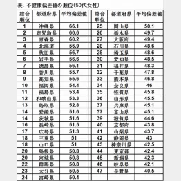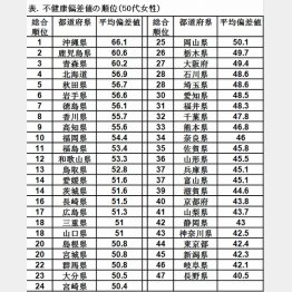50代女性の不健康偏差値、総合1位は沖縄県で、2位以下を大きく引き離している。BMI(不健康偏差値88.3)、中性脂肪(同81.4)、γ‐GTP(同76.4)、尿蛋白(同75.9)など、いずれも際立っている。受診者たちは、この先10年以内に60代になるのだから、沖縄県はそう遠くない将来、生活習慣病を抱えた中高年で溢れかえるのは確実だ。