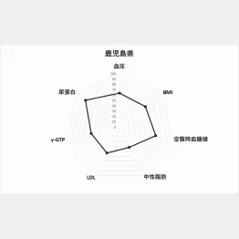 2位は鹿児島県(40代では5位)。50代男性でも4位に入っており、不健康強豪県の代表格と言っていい。レーダーチャートを見てみよう。尿蛋白(全国1位)と空腹時血糖値(全国2位)の偏差値が飛びぬけて高く、血圧とBMIの偏差値も60を超えている。昨日取り上げた50代男性のレーダーチャートと、傾向は同じだ。県民性が男女共通に出ているとということか。