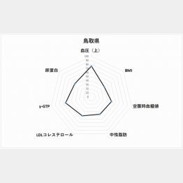 10位の鳥取県は、血圧の偏差値が高いことが特徴だ。偏差値75.5で、秋田県に次いで全国2位。50代男性100人中、7.4人が血圧160以上という結果になっている。しかしこれといった原因が浮かばない。