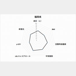 福岡県は、BMI(偏差値46.4)こそ低いが、ほかの項目はすべて高めで、高知県と同じくバランスのよい不健康県だ。とくにLDLコレステロールの偏差値が高い(65.9)。