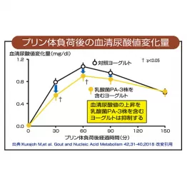 「ヨーグルト等の乳製品はプリン体が非常に少なく、しかも、乳タンパクに含まれるカゼインには尿酸を排泄しやすくし、尿酸値を下げる働きがあるといわれています。中でもヨーグルトには、腸管内で尿酸の元になるプリン体の吸収を抑える働きが報告されている乳酸菌PA-3株を含むものもある。このヨーグルトなら、尿酸を排泄しやすくする乳タンパクの特徴と合わさって、尿酸値の上昇を抑える働きが期待できます」(大山医師)