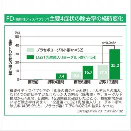 今回の調査でも、「胃に良い」と思う食品について聞いてみたところ、第1位は「ヨーグルト」(約66%)、2位は「お粥」(約43%)、3位は「豆腐」(約34%)と、胃にやさしいイメージのある食品が上位にランクインした。ヨーグルトの中には胃の不調症状に特化した乳酸菌もあるようだ。たとえば、LG21乳酸菌を含むヨーグルトは、胃の不調症状を軽減するという効果があることも報告されている(上図)。