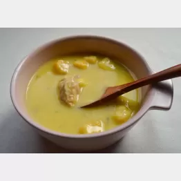 カップタイプのパンプキンスープにサケ缶を加えると、体が温まるばかりか、うま味もアップし「ビストロ級の味わい」に!