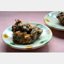 ボウルにピーナツバター、レモン汁、すりおろしたニンニクを加えて混ぜ、レバーを串から外してボウルに入れてあえる。器に盛り、黒すりゴマを振りかける。