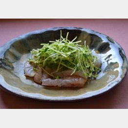 器にタイの刺し身、ザク切りにした豆苗を盛りつけ、フライパンで煙が出るまで熱したごま油、たれを回しかけ、黒こしょうを振る。