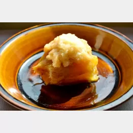 焼きいもを半分にカットして器に盛り、皮をむいてすりおろしたリンゴをのせ、ハチミツをかける。