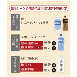 「糖分が多く含まれるスポーツドリンクは吸収されやすい半面、エネルギー消費量がそれほど高くない大半の人にとっては飲みすぎによる一過性の糖尿病リスクや肥満リスクが避けらない。経口補水液は脱水症状に陥った際、医師から指示された場合に限って飲むべきもので、自己判断で予防的に飲むと塩分の過剰摂取になる恐れがあります」