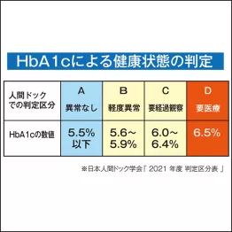 人間ドックや健康診断などで血糖の状態を示す指標であるHbA1c(ヘモグロビンエーワンシー)が6.5%以上であれば糖尿病と診断される。しかし、HbA1cがその手前の5.6〜6.4%の場合でも少しずつ「血糖負債」がたまってしまい、体が徐々にむしばまれていく恐れがあると言うのだ。