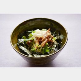 茶わんにごはんを盛り、缶汁をきって軽くほぐす。レモン汁をふったサンマ、粗く刻んだラッキョウをのせ、刻みねぎを散らし白すりゴマをふって、もみのりをまぶす。