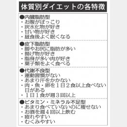 高杉さんがお勧めするのが、体質別ダイエット。食生活や生活習慣で「内臓脂肪型」「皮下脂肪型」「代謝不良型」「ビタミン・ミネラル不足型」に分けられる(表)。対策は次の通り。