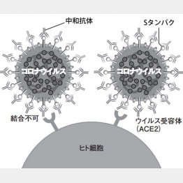 【A】「新型コロナウイルスの感染を防ぐ『カシリビマブ』と『イムデビマブ』の2種類の中和抗体を組み合わせた点滴を投与するというものです。左のイラストに示したように、中和抗体はコロナウイルスの表面のスパイク(S)タンパクにくっつく抗体です。それによって感染細胞のACE2レセプター(ウイルス受容体)が体表面の上皮細胞などに結合しなくなるため、感染が体内に広まらなくなる仕組みです」