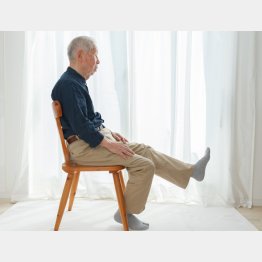 ①椅子に座り、ひざを支点にして、片方の足を前方に伸ばす。このとき、つま先が上を向くようにする。足全体が床と水平に一直線になるまで上がると理想的②足を床に戻したら、同様に反対の足を前方に伸ばす。これを交互に行う。手は体を支えやすいように、後ろで組んでも、椅子の両脇に置いてもかまわない。