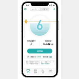 ①膀胱の膨らみの状態を1~10の数値で表示。また、時系列別(グラフ)で尿のたまり具合を確認することもできる。