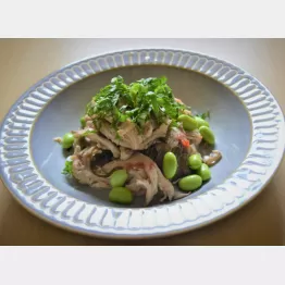 脾の働きを強めて食欲不振の解消に役立つ、マイタケ、鶏肉、枝豆を組み合わせたレシピ。鶏肉はコンビニで販売されているサラダチキンを使い、レンジで手軽に作れます。食欲増進に良い青じそと梅干しの風味がさわやかで、食が進む味わいです。