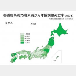 逆に日本列島を北に行くほど、西に進むほど、がん死亡率が上昇する。男性で最も高いのは青森県(同113.7人)で、長野県の約1.7倍となっている。つまり青森県の75歳未満の男性は、長野県の同世代の男性よりも、がんで亡くなるリスクが70%も高い。