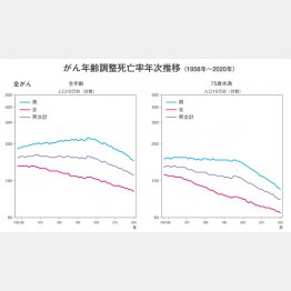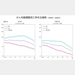 男性(全年齢)では、1990年代中ごろをピークに、急速に下がり続けている。とくに75歳未満に限れば、1990年代と比べて、がんで亡くなるリスクが3分の2に下がっている。現役世代や前期高齢者(65~74歳)で、がんで亡くなるリスクは急速に低下しているのである。