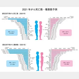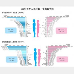 がんの死亡数、罹患数(新規がん患者数)の実数は、図のようになっている。いずれも2021年になっているが、この種の統計は1~2年遅れて公表されるのが普通である。「予測数」というのは、まだ数字が確定していない、概数という意味である。2021年にがんで亡くなった人は男女合わせて37万8600人、罹患数は合計100万9800人だった。