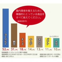次に、腸内環境のために食べている食品にはどんなものがあるのかを聞いてみると、最も多かったのが「ヨーグルト」(52.9%)。以下「納豆」(31.7%)「チーズ」(18.1%)「キムチ」(14.0%)「きのこ」(13.1%)「バナナ」(11.3%)となり、ヨーグルトを筆頭に発酵食品を積極的に摂っている人が多いことが分かった。