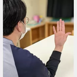 では、やり方です。手のひらを自分の顔に向け肘を90度に曲げます。その姿勢を保ったまま、肘をテーブルの上に乗せます。肩に力が入らないようにリラックスした状態で、小指側に手を10回揺らしてみましょう。