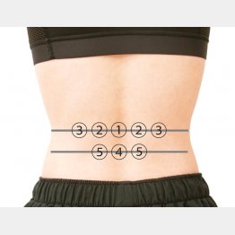 いずれも、ウエストの一番細いくびれのライン上にある。くびれラインと背骨が交差するところにあるのが「命門(①)」、背骨から左右に指の腹2本分移動したところにあるのが「腎兪(②)」、背骨から左右に指の腹4本分移動したのが「志室(③)」。両手を腰に当てた時、親指が当たる場所にあるのが腎兪なので、その内側が命門、外側が志室と覚えるとわかりやすい。