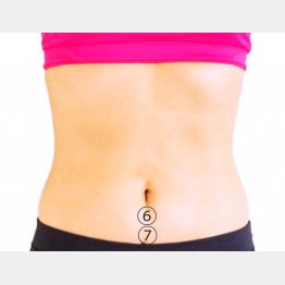 「気海(⑥)」はおへそから親指の腹1.5本分下、「関元(⑦)」はおへそから指の腹4本分下にある。